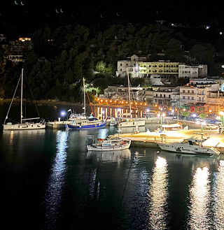 Das schönste Plätzchen im Alonissos-Hauptort Patitiri ist oberhalb des Hafens auf einem Hügel, den ein paar kleine Hotels krönen. Von hier aus sieht man (selten) Fähren und (oft) Segelboote einlaufen. An der Hafenfront gibt es ein paar Tavernen, Geschäfte, Mietwagenbüros, es geht ausgesprochen entspannt zu, niemand drängelt hier. Dahinter ziehen sich ein paar ruhige Straßenzüge einen Hügel hinauf. Und dies ist - mit dem zusammengewachsenen Ort Votsi - schon der lebhafteste Ort auf der Insel mit ihren nur 2 000 Einwohnern.